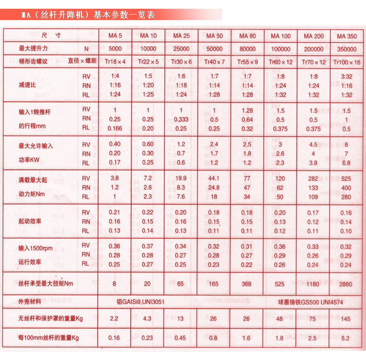 MA蝸輪絲桿升降機(MA系列螺旋升降機)是我公司參照國外公司的產品而設計生產的新型蝸輪絲桿升降機。與其他蝸輪升降機相比具有結構更加緊湊、安裝方便、體積小、輸入形式多樣、可靠性高、壽命長等許多優(yōu)點。